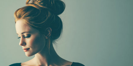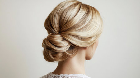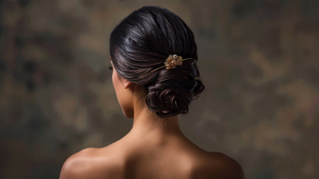 Elegant hairstyle featuring woman with sophisticated updo adorned with decorative hairpin. soft lighting highlights smooth texture of hair and graceful neck, creating serene and refined atmosphere