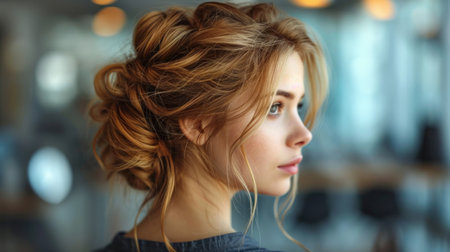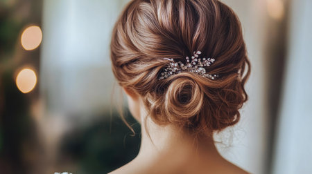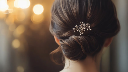 A beautiful portrait capturing an elegant hairstyle with subtle accessories. The soft focus and warm tones evoke a serene, refined ambiance, perfect for inspiration.
