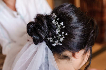 Top view of hairstylist making bridal hairstyle. Closeup of Hairdressers hands attaching veil and pearl decoration to bride hair. Wedding day