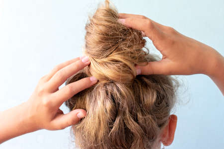 The girl straightens the disheveled bun on her head with her hands. Modern fast hairstyle. Blue background. Blond curly hair.