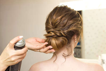 The stylist performs the hairstyle, hair styling in the salon. Splashes hairspray.