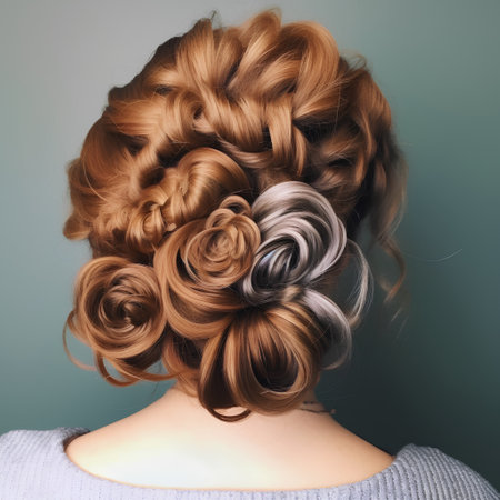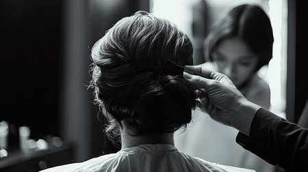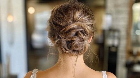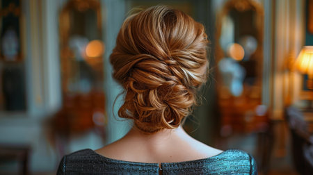 rearview of a woman looking at her hair which is in an updo, created with generative ai