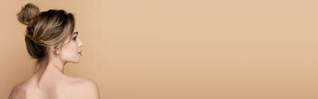 back view of young woman with naked shoulders isolated on beige, banner