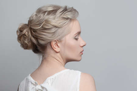 Gentle blonde model woman with updo hairstyle on white background