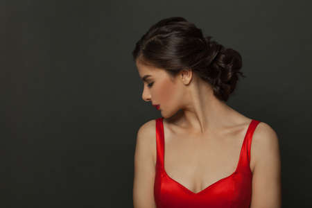 Stylish brunette woman profile. Beautiful lady with classic hairstyle on black background