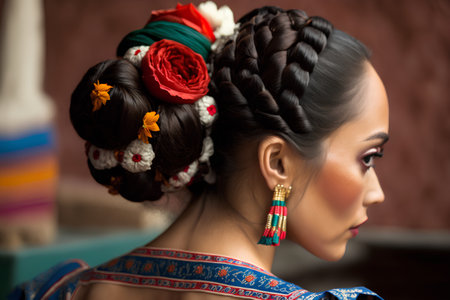 Woman showing creative hairdo with elegant floral hair accessories