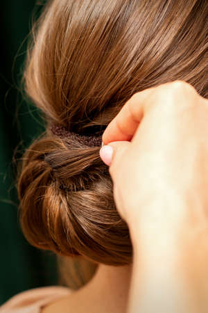 Stylist hands making hairdo with a hairpin
