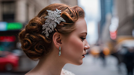 Captivate your audience with this stunning portrait of a bride featuring vintage hair accessories, set against an urban backdrop. The serene profile showcases grace and elegance, making it ideal for wedding or fashion-themed projects.