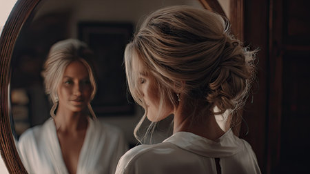 A beautiful woman with a sophisticated hairstyle reflects on her day in a mirror, illuminated by soft, natural light that creates a tranquil atmosphere.