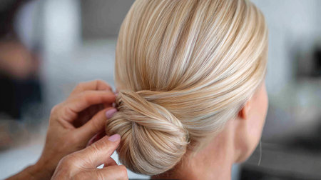 A professional hairdresser styles a beautiful blonde woman's hair into an elegant bun in a bright and modern salon, showcasing artistry and beauty.