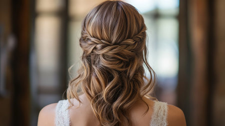 Elegant half-up, half-down hairstyle with loose waves and a delicate braid, perfect for a romantic and youthful appearance.