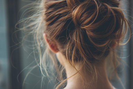 Close-up photo capturing the intricate details of a woman's stylish messy bun hairdo