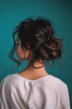 Close-up photo capturing the details of a woman's chic messy low bun hairstyle against a teal background