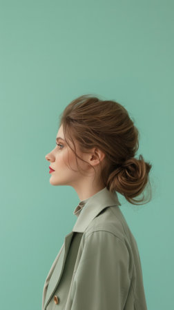 A woman with a bun in her hair standing against a green wall, AI