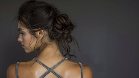 Beautiful woman back with updo hairdo on gray background