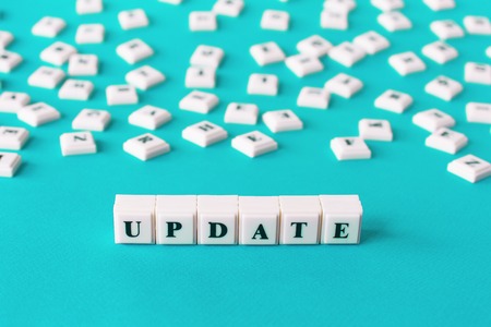 Business or education concept of updating a system, offer or personal knowledge and abilities - plastic cubes with letters to read Update on blue background. Business. UPDATE Concept