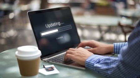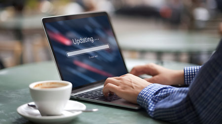 A focused businessman working on a laptop with an updating progress bar in a modern cafe, enjoying a cup of coffee.