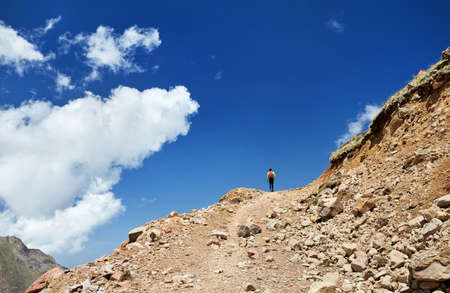 Hiker in yellow shirt going on the trail with rocky mountains at blue cloudy sky background