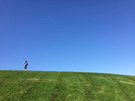 Child standing on the green grass. Human being in a huge World.
