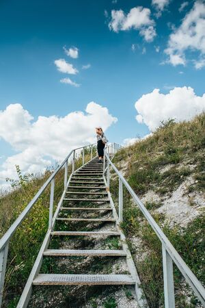 Young girl tourist climbs or goes up large steel staircase on mountain hill, summer travel adventure concept.