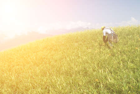 asia man running on green grass at chuifong tea garden in Chiangrai Thailand