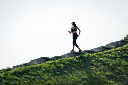 Slender beautiful girl with dark hair runs down the stairs, a symbol of healthy lifestyles, a strong leader and healthy competition. Horizontal frame