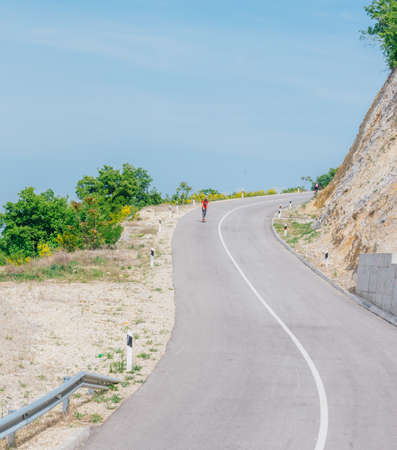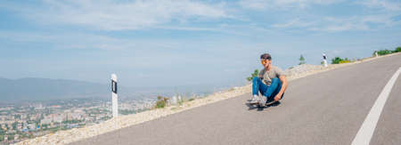 Urban cool longboarder preparing for a downhill ride(slide) doing few stunts and trick on his longboard, grabbing the board while riding.