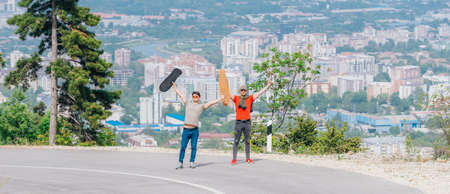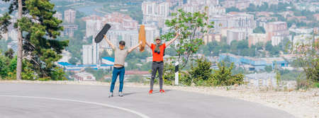 Sporty athletes holding their longboards high in the air and cheering up on a nice sunny day wearing red and green shirts.