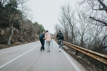 Group of friends walking in nature on a cloudy day enjoying the outdoors