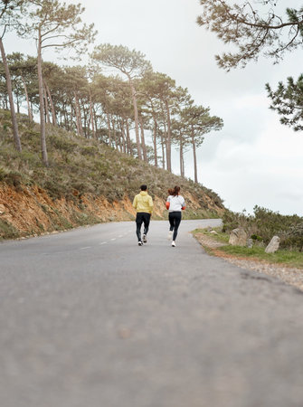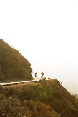 Young fitness couple jogging together on a hill