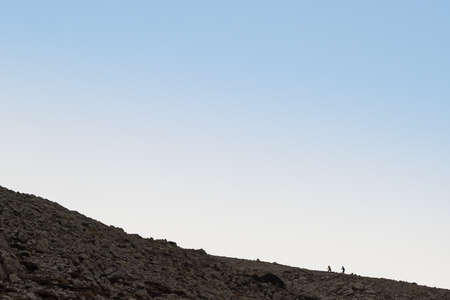 Silhouette of two tourists with trekking poles climbing mountain at sunrise