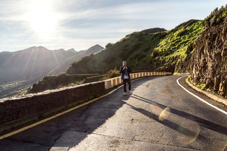 Mountain Road Person Walking Forest Sunny Path Scenic Mountain Valley