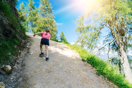Child girl climbs to the top of the mountain