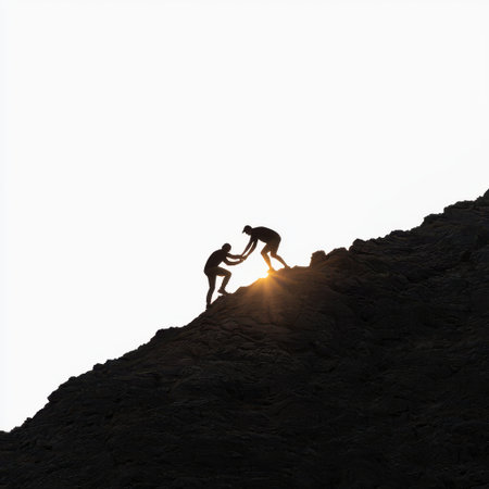 Two Climbers Engaging in a Challenging Ascent Against a Bright Sunset on a Rugged Mountain Edge Silhouette