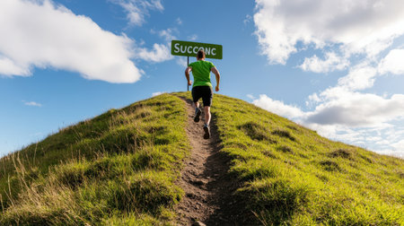 A person running up a hill toward a large sign that reads 'Success,' symbolizing goal achievement