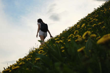 Woman climbs a hill along a path among flowers on a summer day.