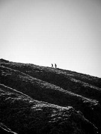 A grayscale low angle shot of two persons walking up a hill
