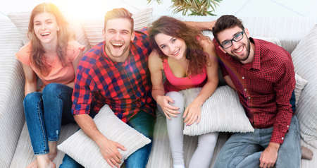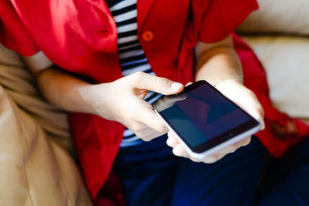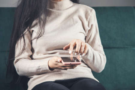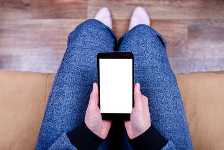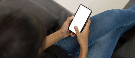 Closeup on mobile phone in hand of young woman sitting on couch. Top side view mock up background