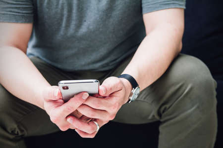 Closeup young man in black t-shirt typing messages on smartphone working from home