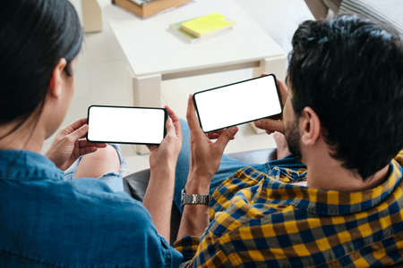 Indian asian young couple using smartphone together while sitting on sofa or couch and modern interior space or home