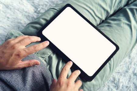 Close up of a young man comfortably lying on a bed with a tablet and touching the screen. Halfshot of a man sitting with black screen tablet in hands. Man's index finger raised over the touchscreen.