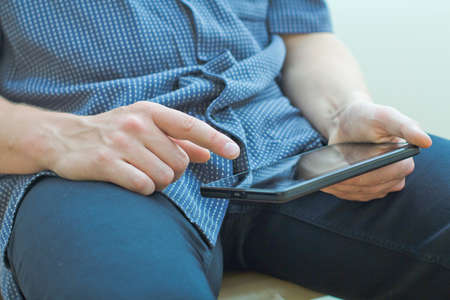 Top-down shot of a long sitting man with a digital tablet on his legs. Man on a sofa starts working on an empty screened tablet. Man slightly touches screen of the tablet with fingers. Home surfing.