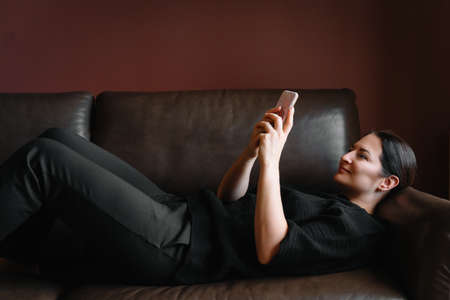 Dark-haired woman dressed in black lying on black sofa with phone in her hands upset after reading bad message and experiencing negative emotions possibly grief, stress, loneliness, loss, fear