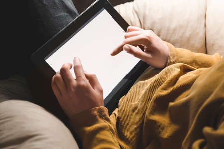 Close-up woman of hand held with digital tablet white screen on sofa in the living room. Concept of technology, connection, communication.