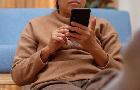 Cropped shot of a woman lying relaxed on couch in living room and texting message on smartphone