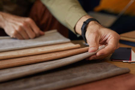 A professional craftsman, sitting at his desk and choosing cowhide in a roll for making leather products