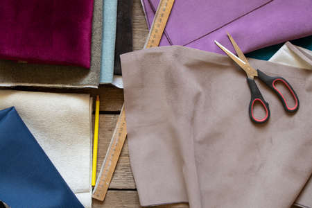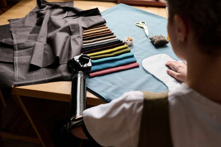 Patterns on the table different pieces of fabric, tailor workshop, sewing and fashion, tailoring