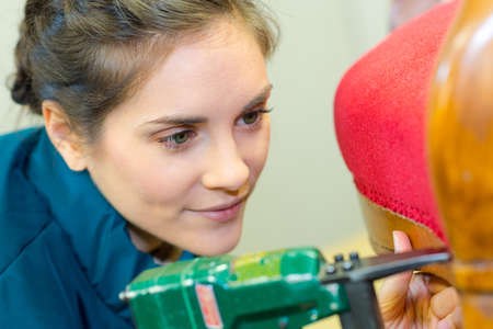 Woman upholsterer restoring vintage chair using pneumatic staple gun in workshop, detailed furniture repair process
