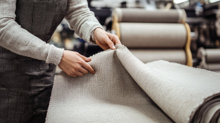 A detailed view of hands inspecting a soft fabric roll in a textile workshop, showcasing creativity and craftsmanship in fabric selection.