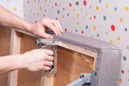 manufacture of upholstered furniture, upholstery of a furniture element with a pneumatic stapler, close-up